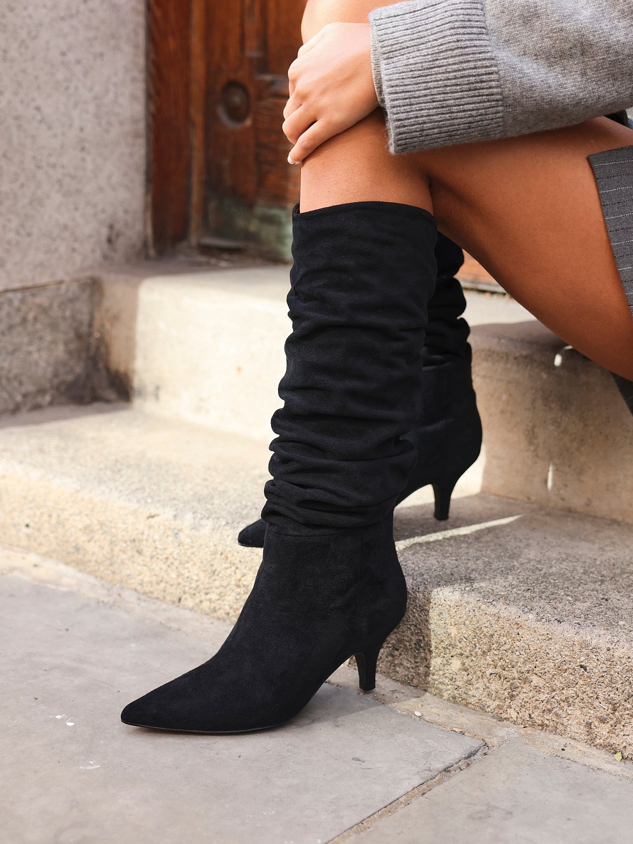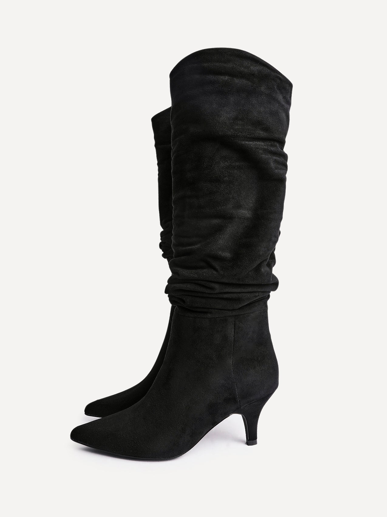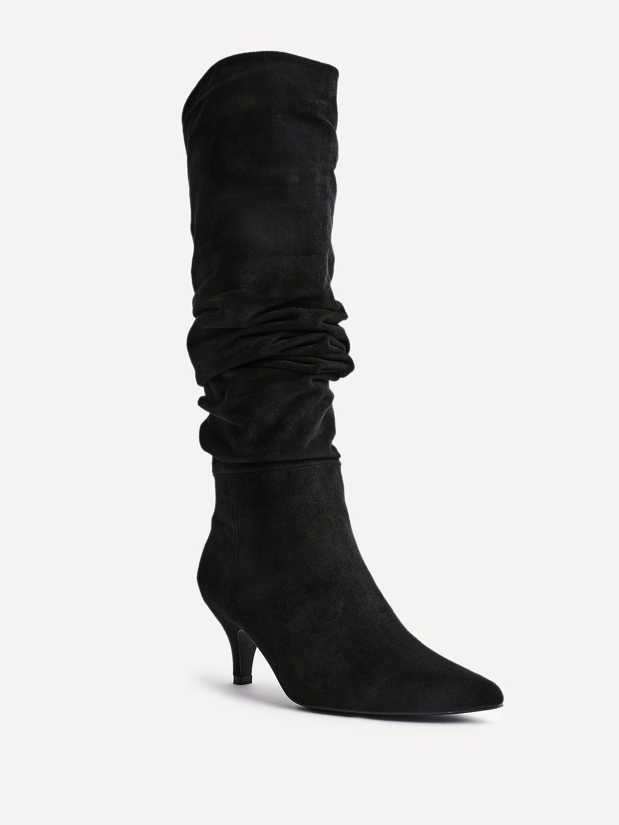 Crafted from soft, high-quality faux suede with elegant ruched detailing, this pull-on high-leg boot is designed for effortless all-day wear. A low 6.5cm kitten heel adds subtle lift, while the cosy fur lining and cushioned inner sock delivers comfort with every step.